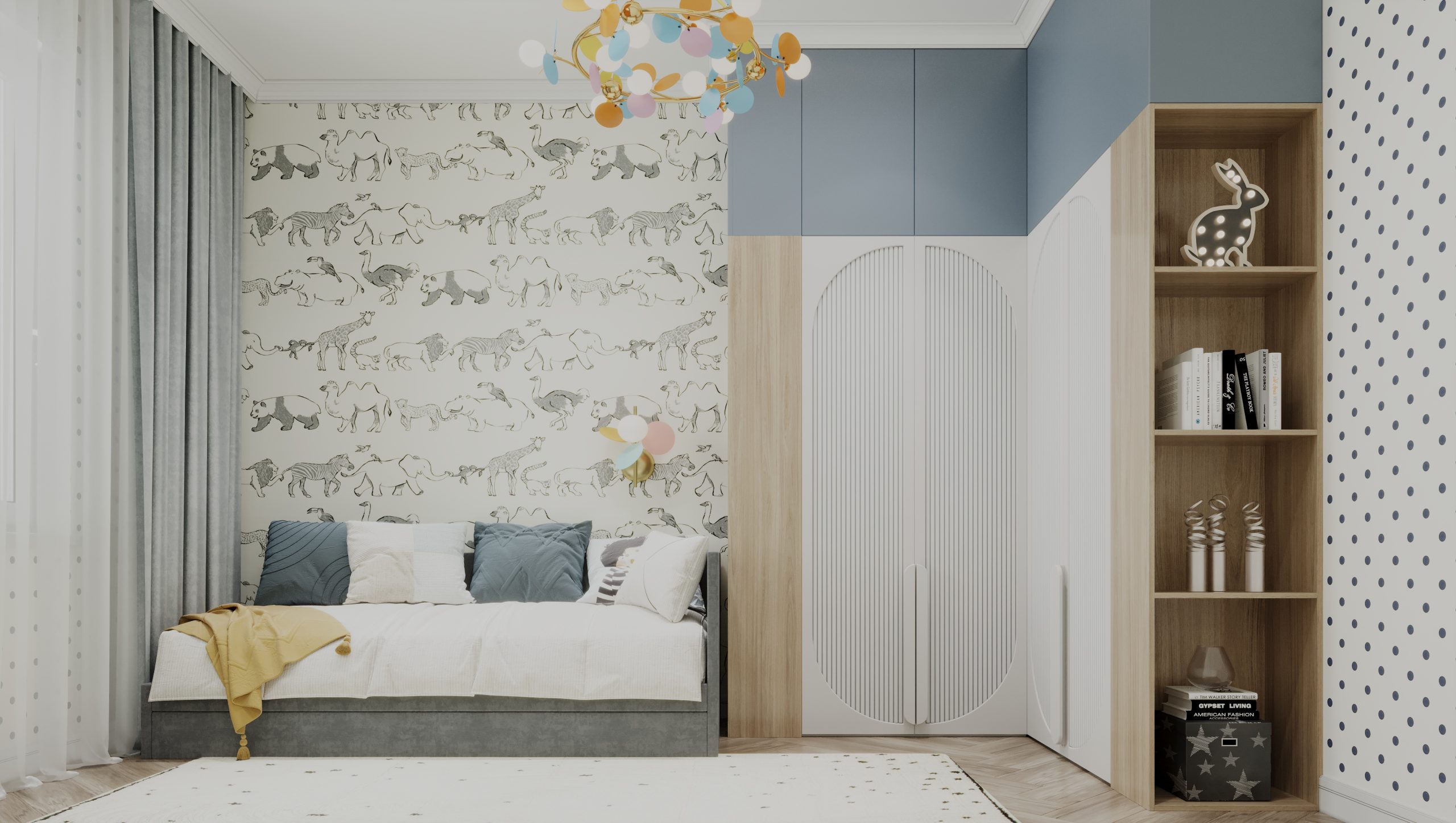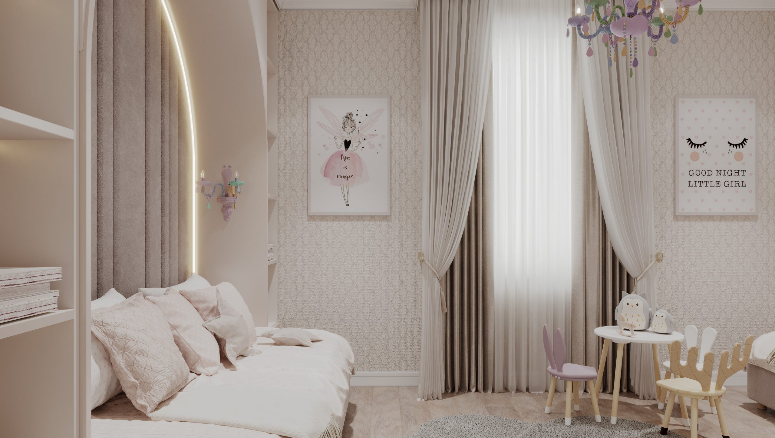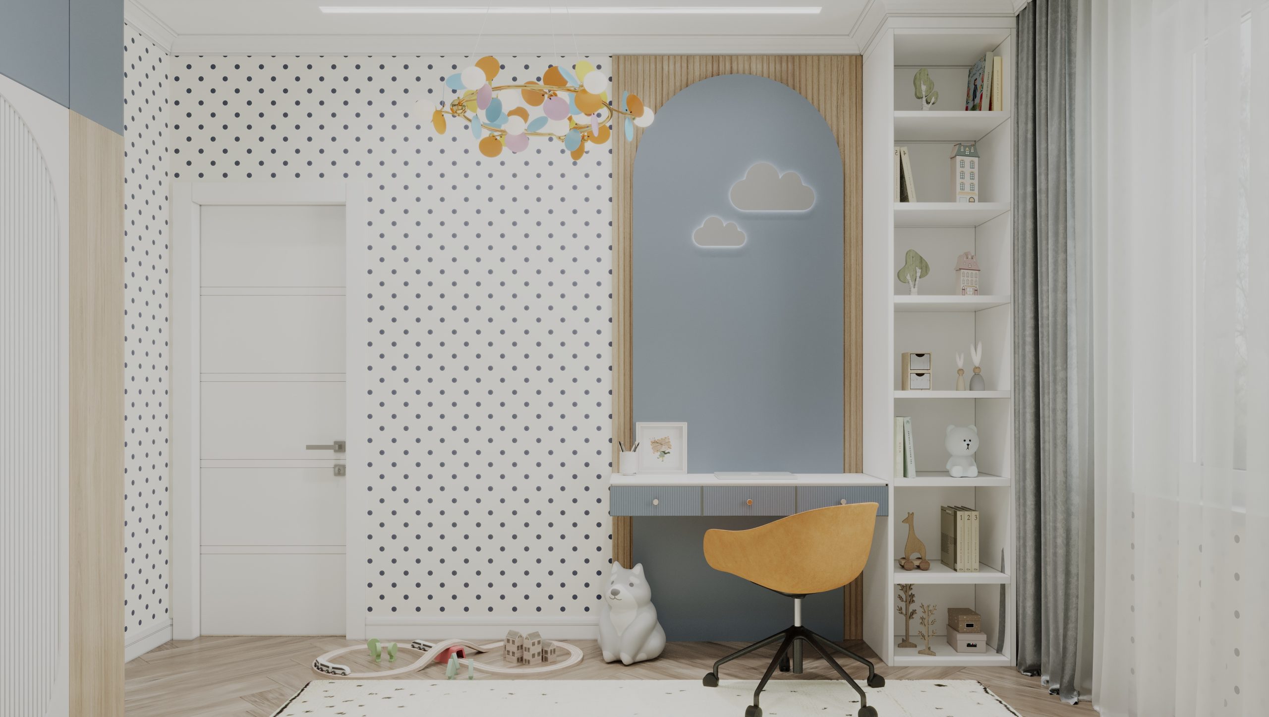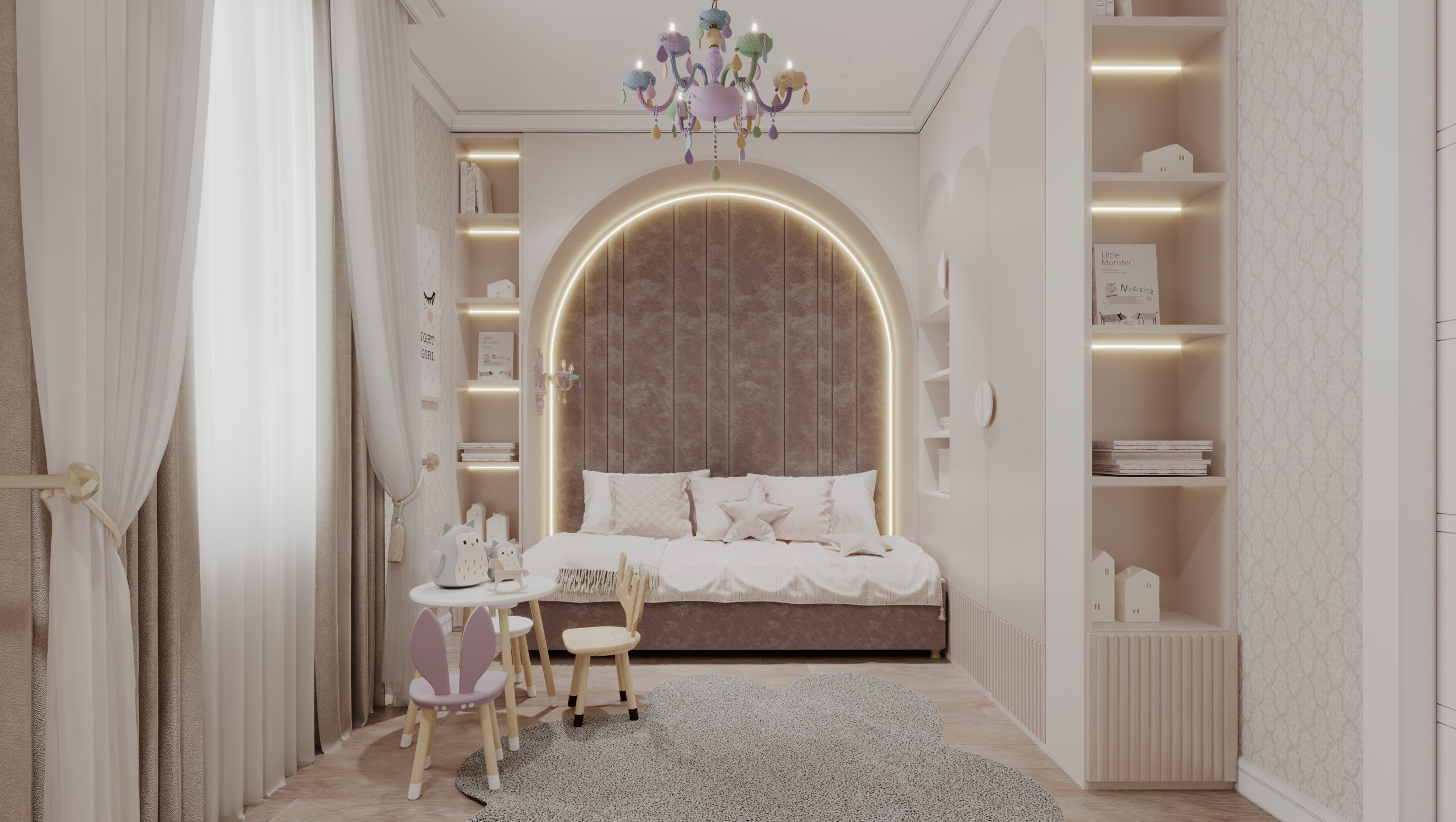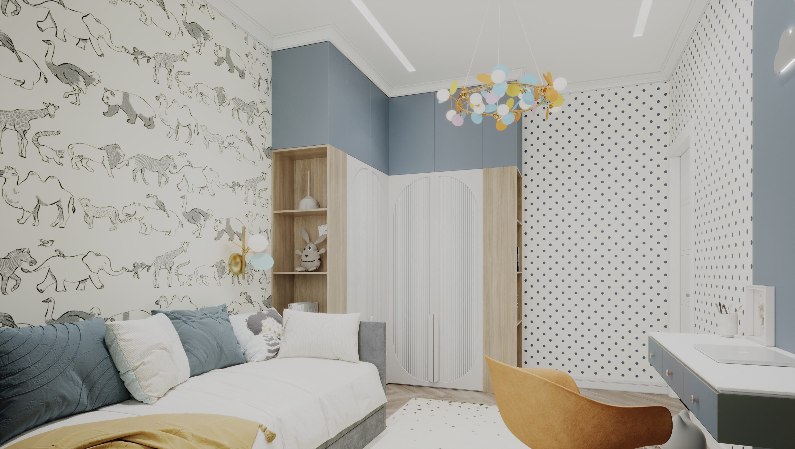 Этот коттедж на 140 квадратных метров создан для большой семьи с двумя детьми — мальчиком и девочкой, где каждый уголок продуман для уюта и комфорта. Детская для девочки радует нежными пастельными тонами, уютной кроватью и игровым столом с милыми стульями, а пространство для мальчика выделяется яркими акцентами и удобной рабочей зоной с креслом. Общая гостиная с кухней-островом и стильной мебелью стала сердцем дома, где собираются все вместе, а большие окна и светлые шторы добавляют воздуха.