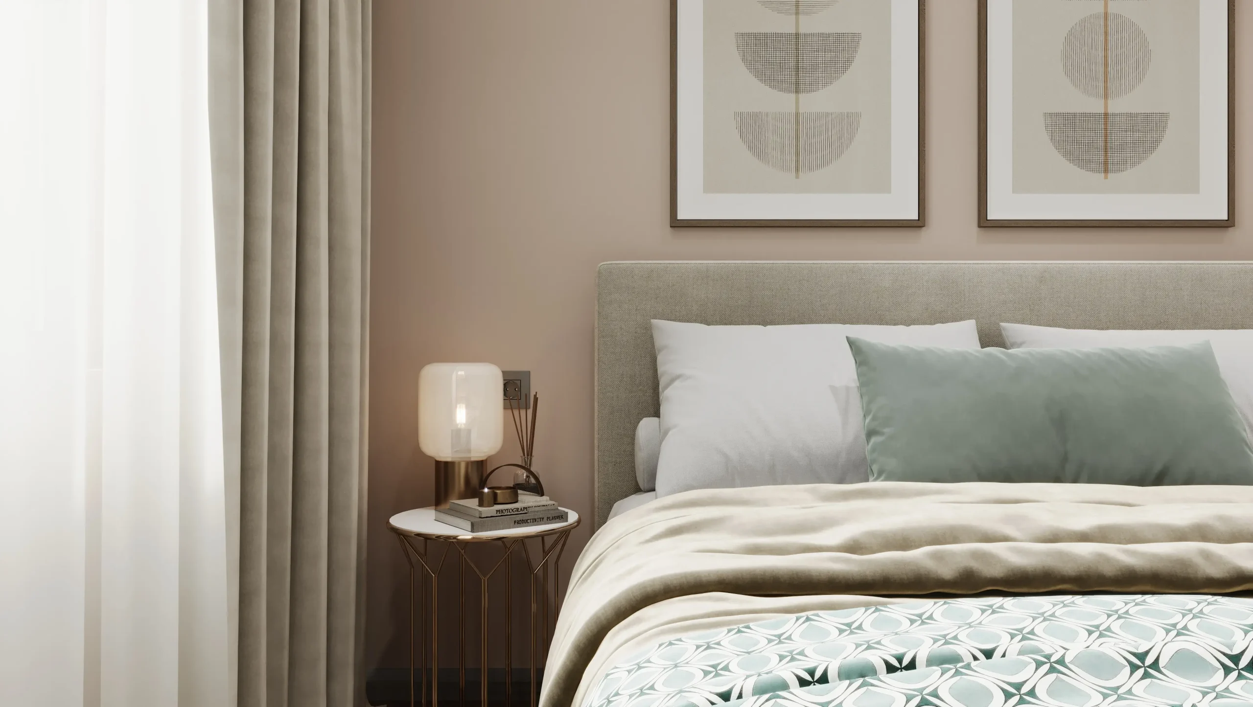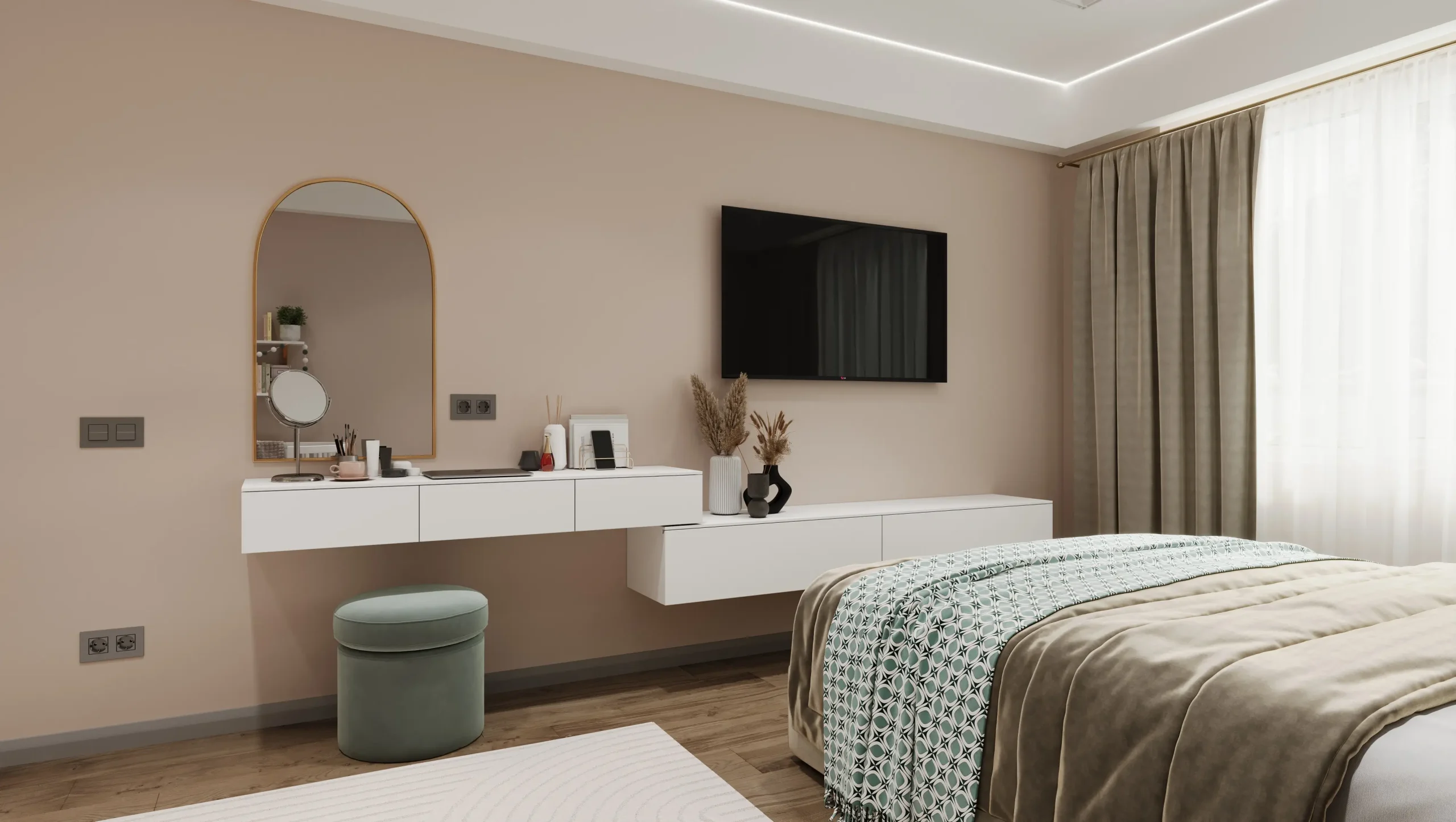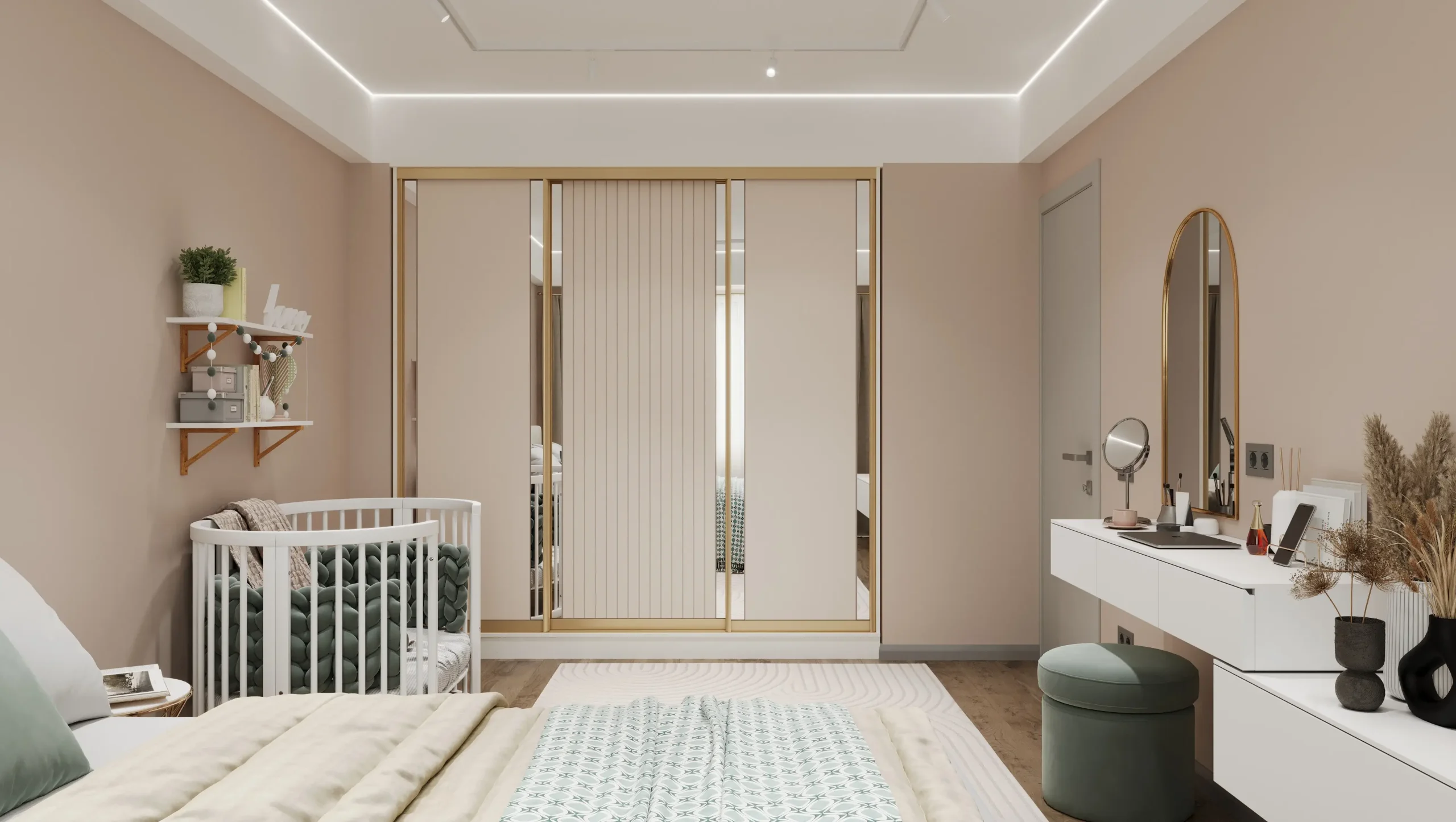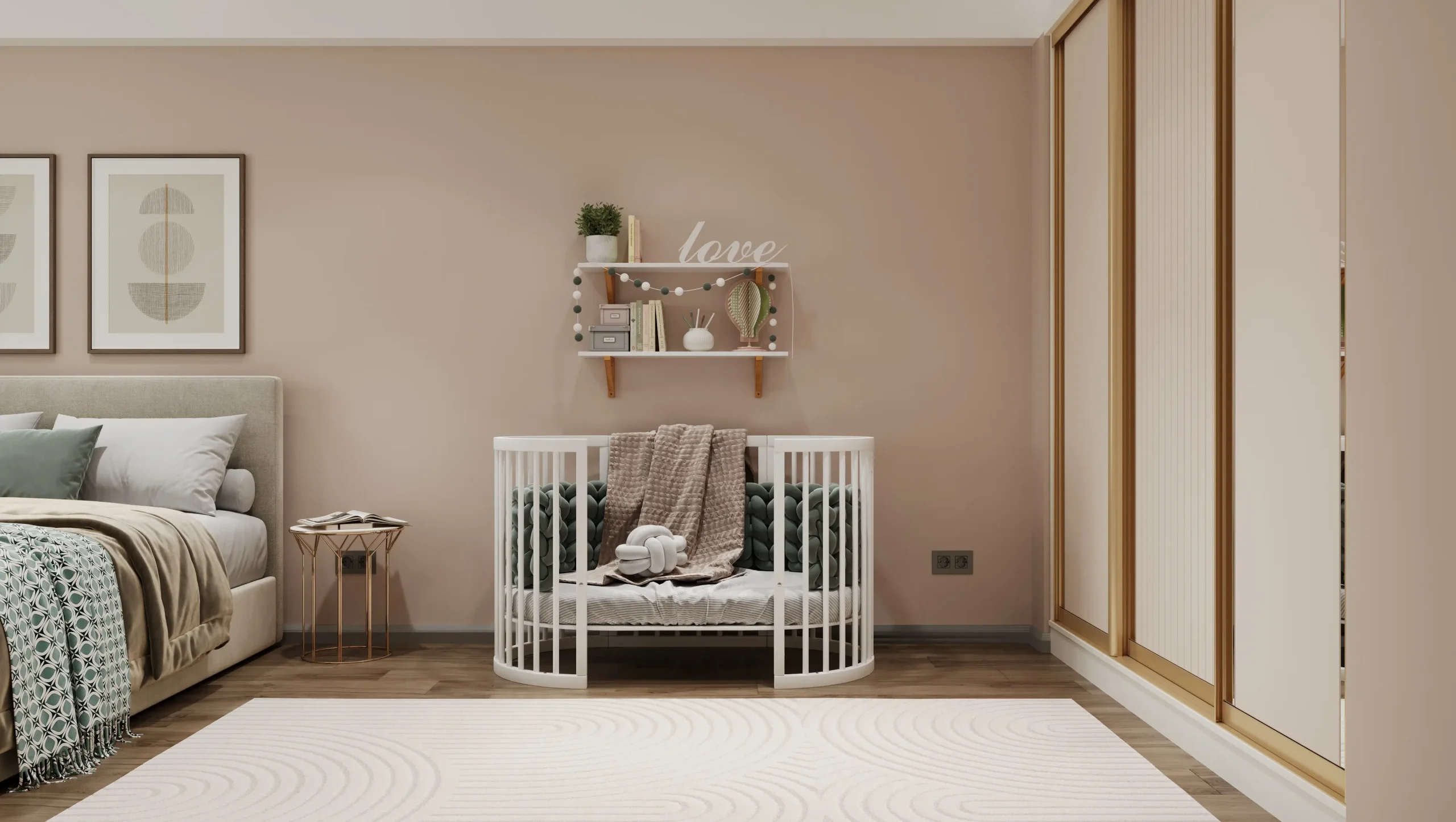 Эта спальня для молодой семьи получилась тёплой и уютной, с акцентом на простоту и функциональность. Пространство оформлено в мягких пастельных тонах, где светлые стены сочетаются с деревянными элементами и удобной мебелью. Кровать с уютным текстилем и детская кроватка с зелёными акцентами создают гармоничный баланс. Мелочи вроде полок с растениями и декором делают интерьер живым и личным.