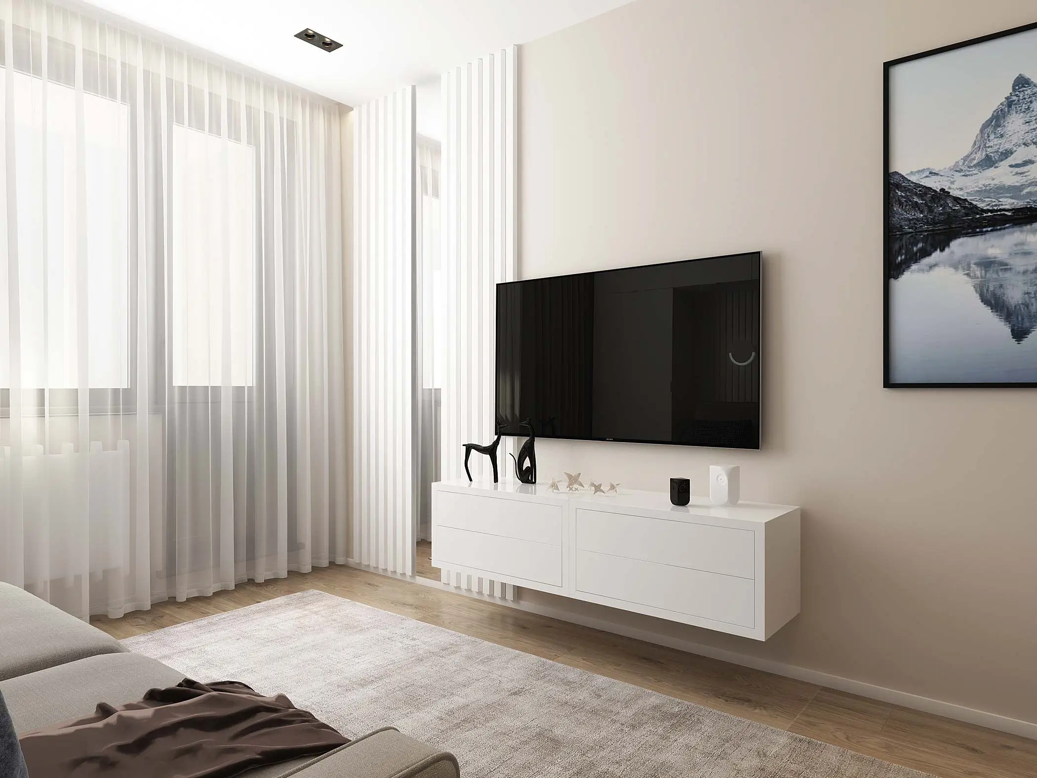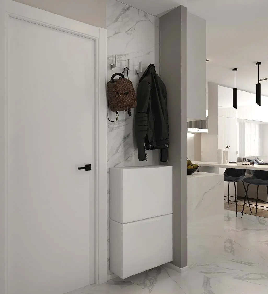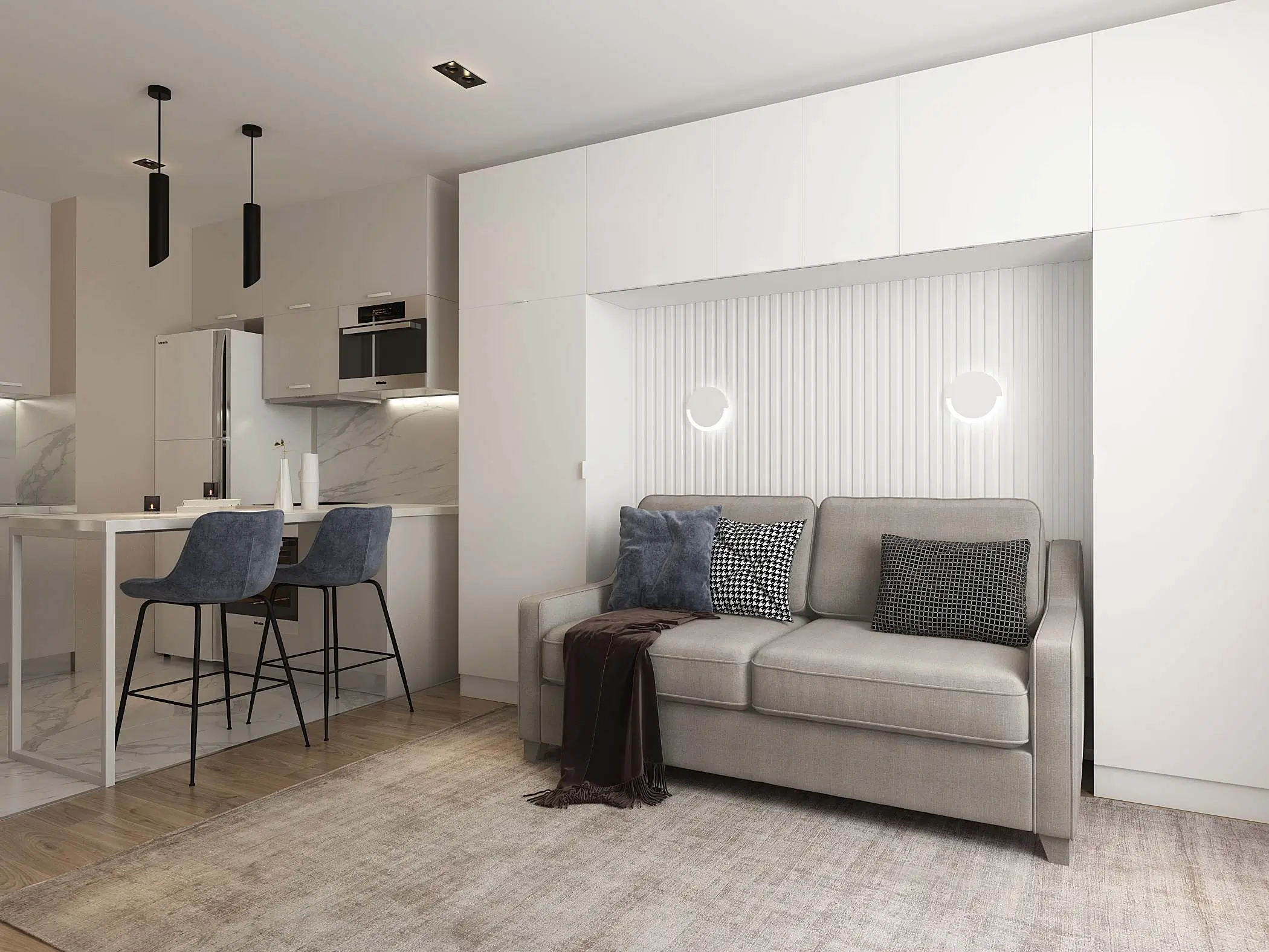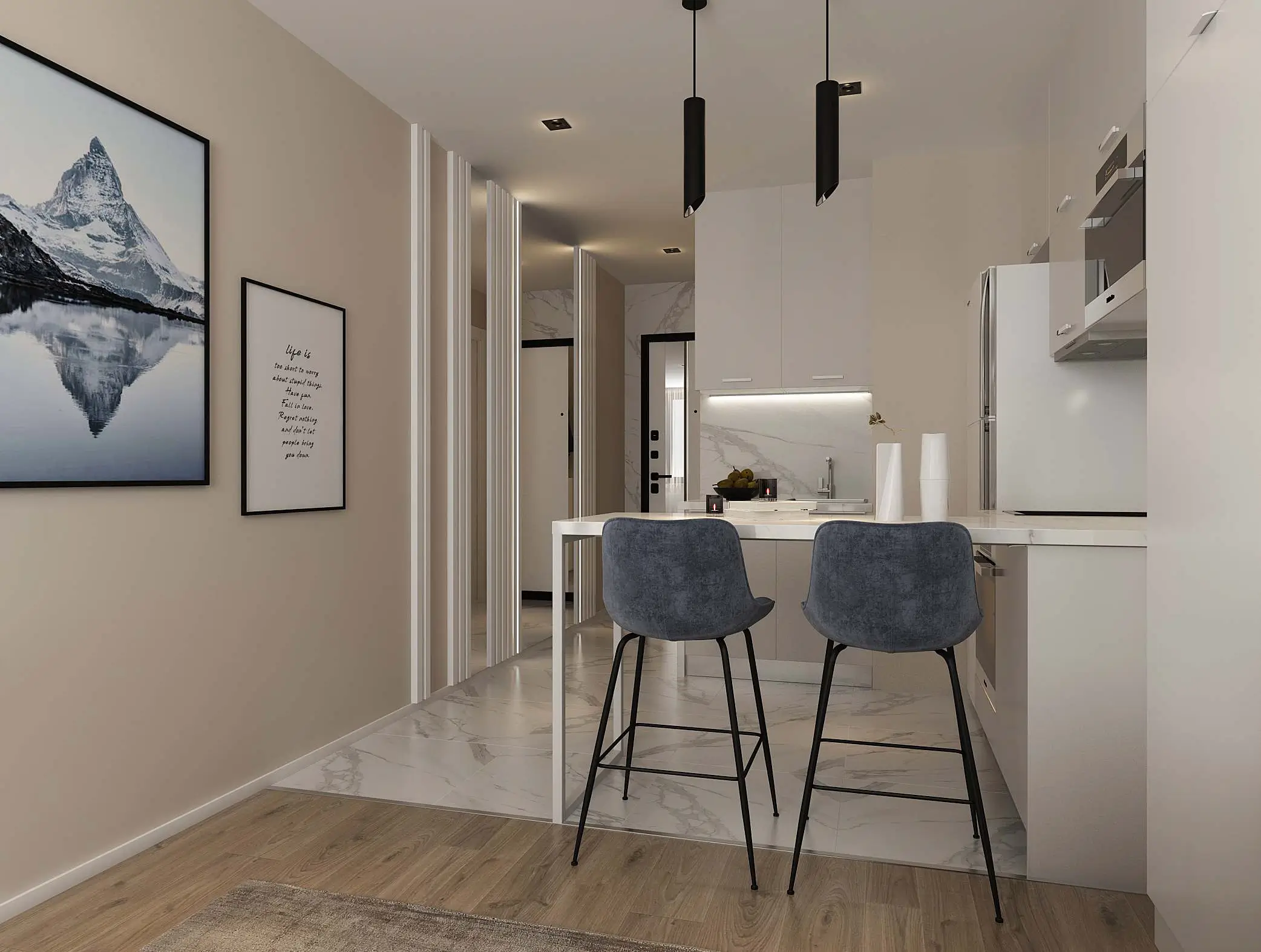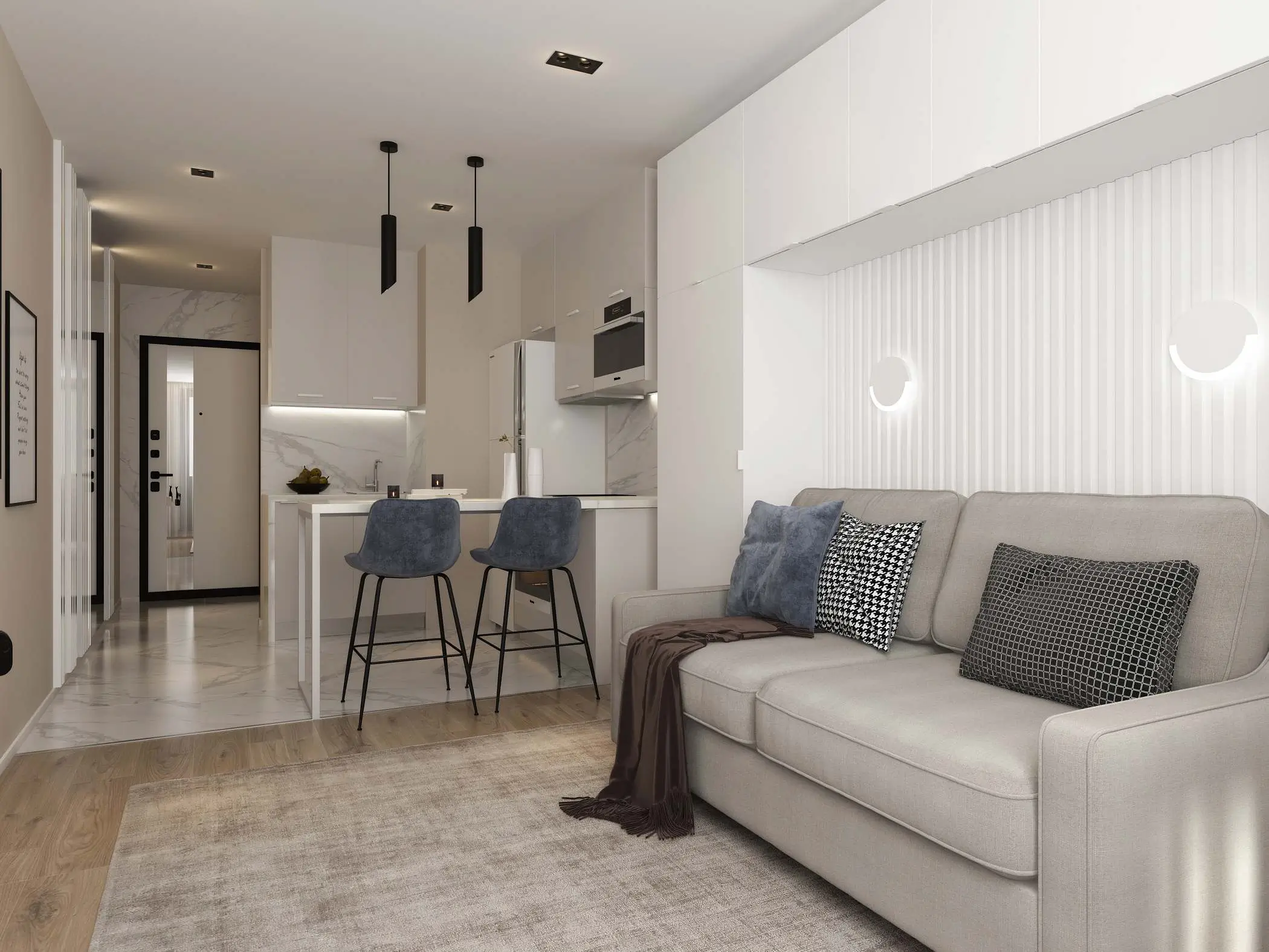 Эта студия в 28 квадратных метров создана для девушки-фрилансера, которая ценит уют и функциональность. Пространство оформлено в светлых тонах с акцентом на мраморные поверхности и современную кухню, где барные стулья и стильные подвесные светильники задают настроение. Спальня с удобным диваном и картинами с природными мотивами создаёт уголок для отдыха, а длинный коридор с зеркалами визуально расширяет помещение. Здесь всё продумано для работы и жизни — от компактной техники до декора, вдохновляющего на творчество.