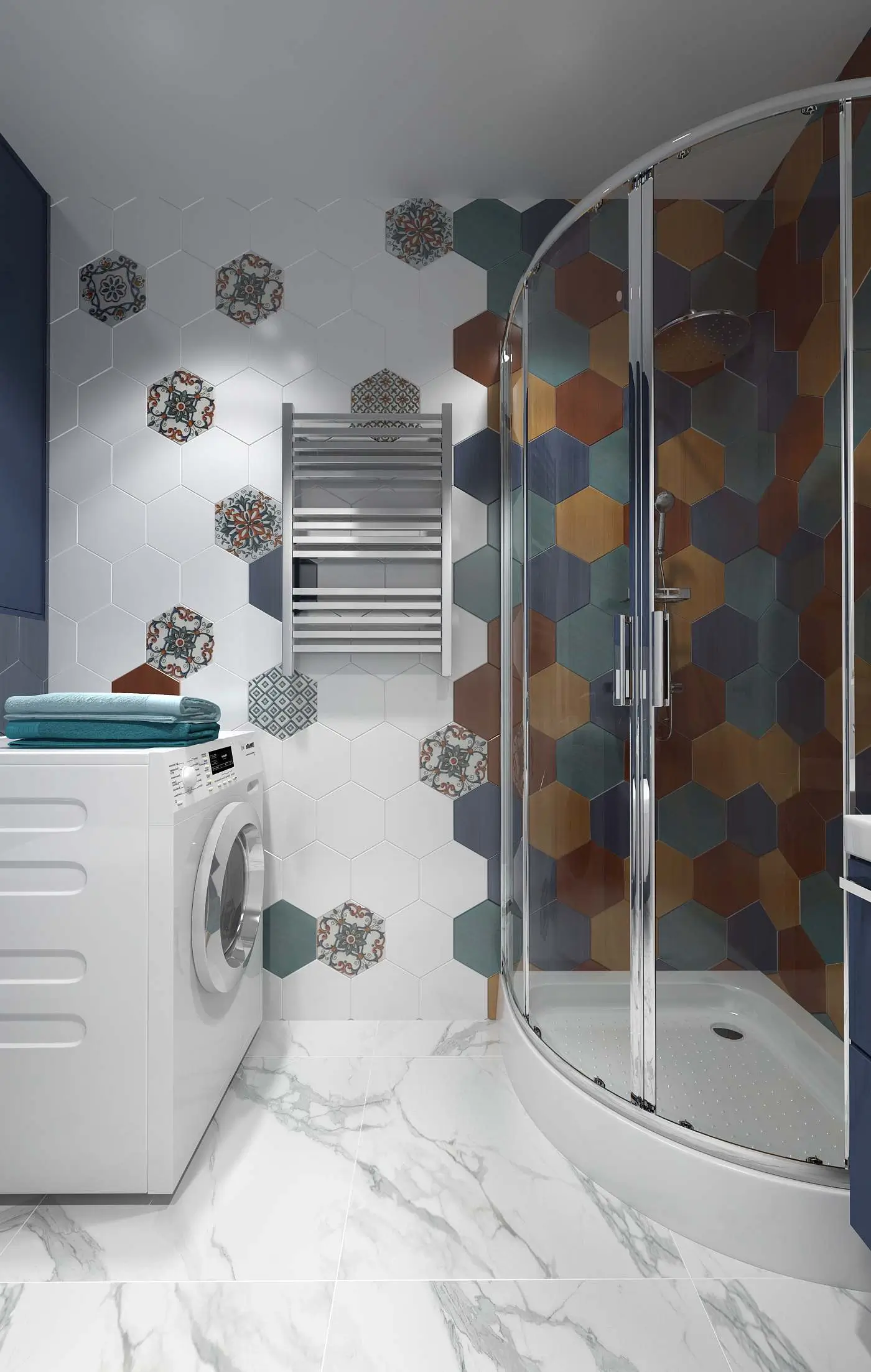 Ванная комната радует смелым решением с гексагональной плиткой в тёплых оттенках и практичным душем, а стиральная машина добавляет удобства. Кухня-гостиная с открытой планировкой идеально подходит для быстрого перекуса или работы за барной стойкой. Мы постарались сделать каждую деталь функциональной, но при этом сохранить ощущение дома, где девушка может расслабиться после долгого дня за ноутбуком.